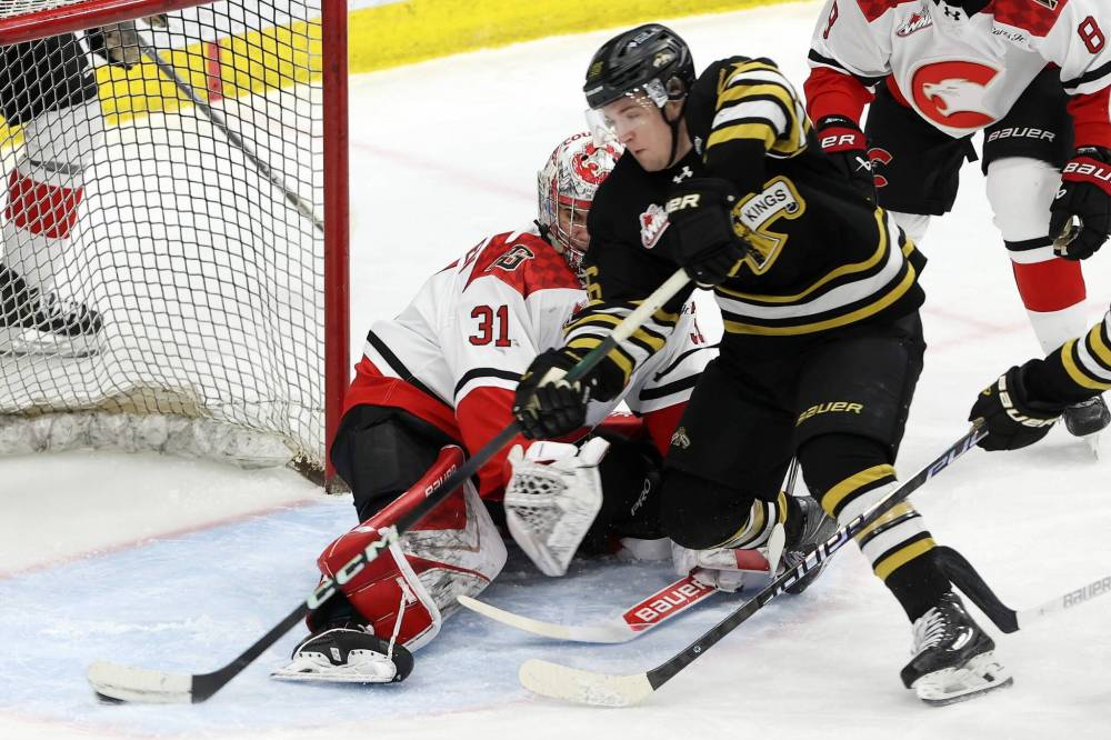 Luke Mistelbacher of the Brandon Wheat Kings wraps the puck around goalie Joshua Ravensbergen of the Prince George Cougars to score a goal during WHL action at Assiniboine Credit Union Place on Tuesday evening. See story on Page B1. (Tim Smith/The Brandon Sun)
