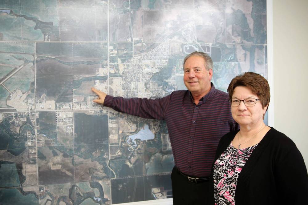 In 2025, Neepawa Mayor Brian Hedley (left) is joined by CAO Colleen Synchyshyn as he points to a 320-acre plot of land the town plans to develop. The town intends to hold future public forums to provide information as development continues. (Connor McDowell/Brandon Sun files)