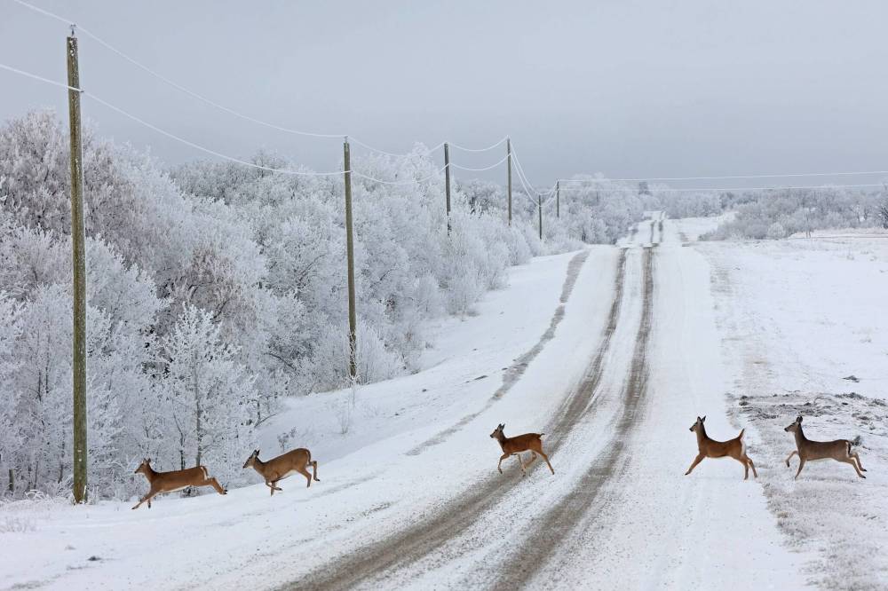 White-tailed deer run across Kirkham Road west of Brandon on a frosty Wednesday morning. Wildlife like waterfowl are a major consideration for conservationists in Manitoba, who look to preserve habitat by striking deals with farmers. (Tim Smith/The Brandon Sun files)